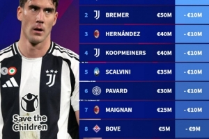 意甲球员身价下跌榜:弗拉霍维奇-1500万欧居首,尤文前十占5席