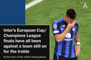 国米7次欧冠决赛对手均有三冠王机会,此前6次3次阻击